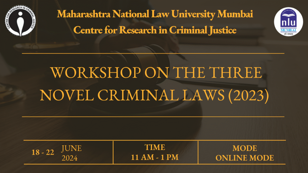 The Centre for Research in Criminal Justice (CRCJ), Maharashtra National Law University Mumbai, organised a five-day Workshop on the Three New Criminal Laws from 18 to 22 June 2024. The workshop was designed to provide a comprehensive understanding of the recently enacted criminal law framework comprising the Bharatiya Nyaya Sanhita, the Bharatiya Nagarik Suraksha Sanhita, and the Bharatiya Sakshya Adhiniyam, which replace the Indian Penal Code, Code of Criminal Procedure, and Indian Evidence Act respectively.